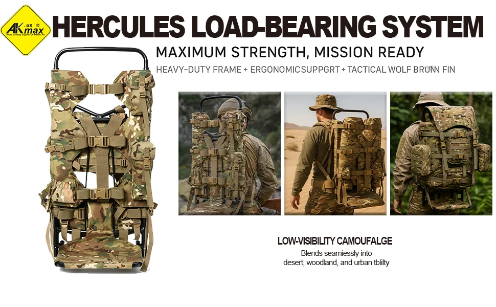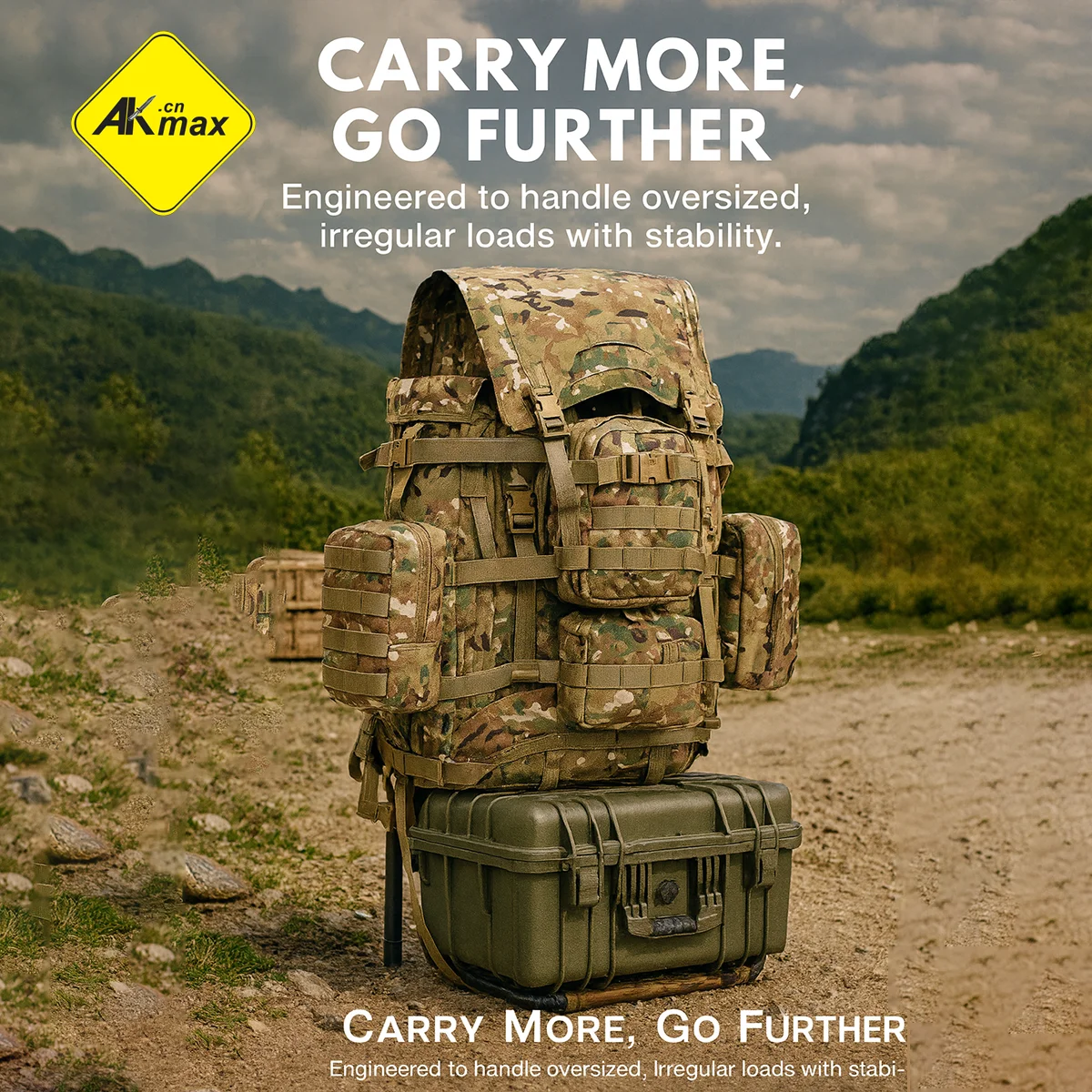 Extra-large load capacity with reinforced aluminum external frame, ideal for long missions, hiking, and tactical use.