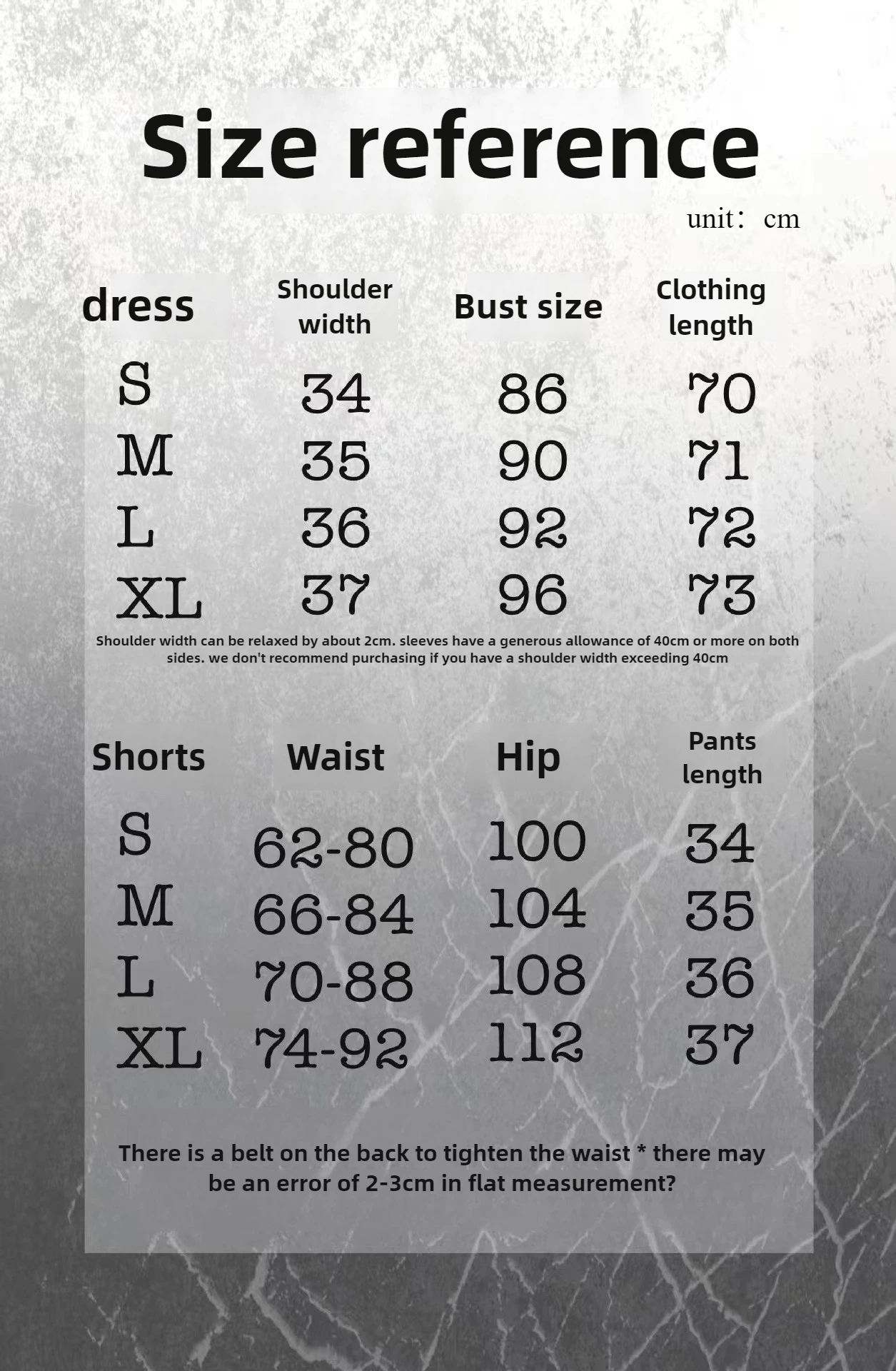 Note:Since manual measurement has certain error, the measurement error of 1-3cm is not the standard for return of goods