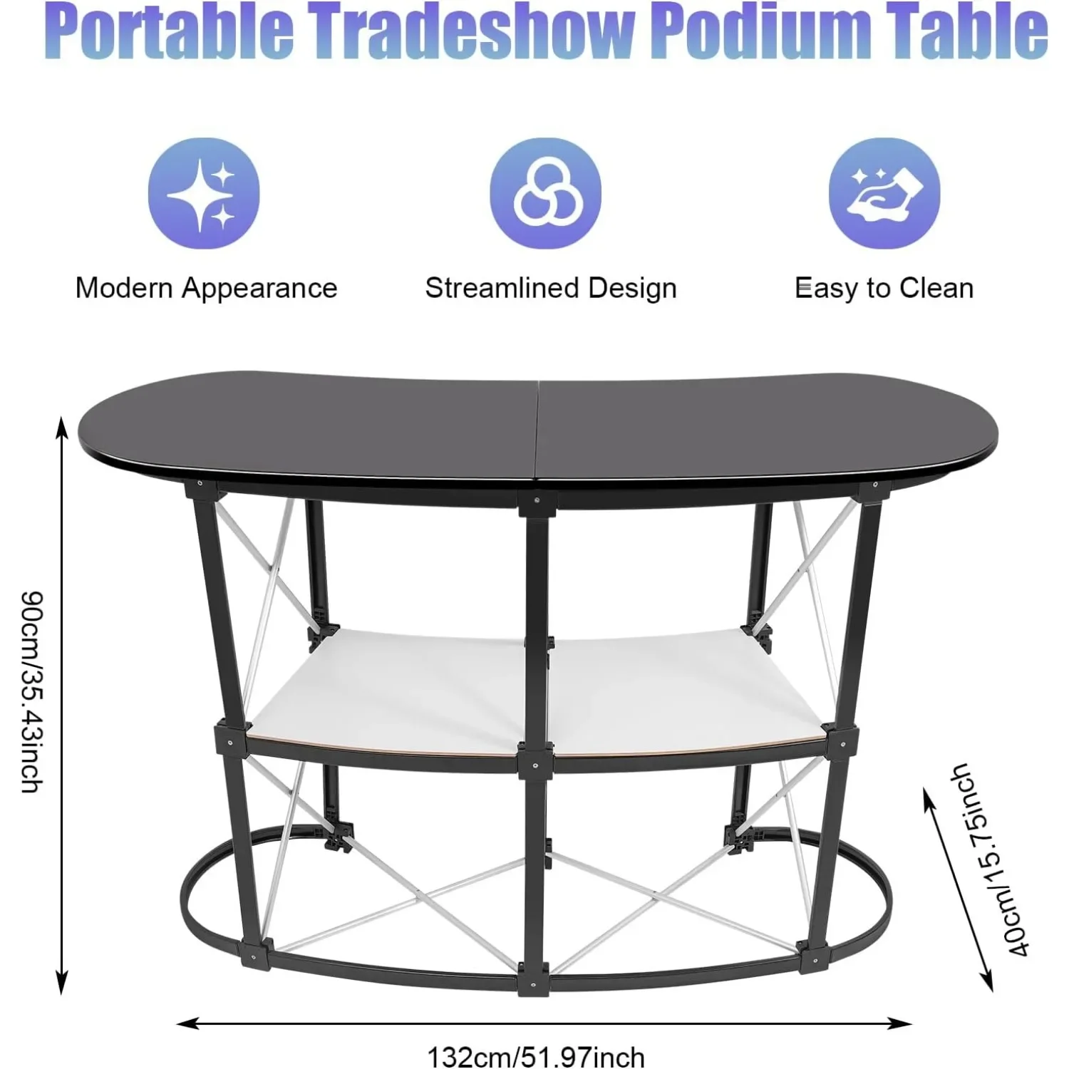 Modern Appearance: The combination of black and white, smooth surface, and curved lines give this trade show counter a modern appearance, making it fit most exhibition styles.