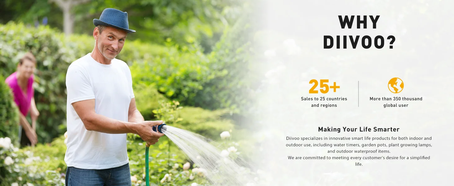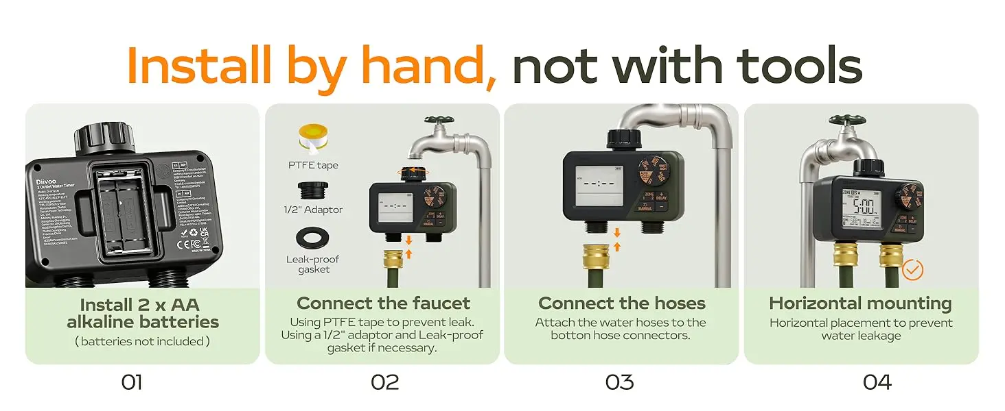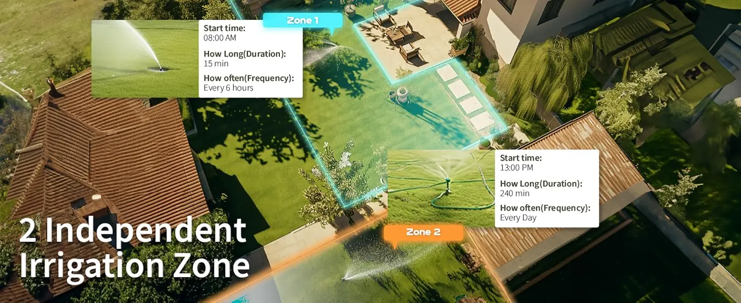 Separate Watering Timer for 2 Zones The watering timer with 2 outputs makes it easier to plan watering separately for different areas. You can set the start time, watering time from 0 to 240 minutes, the watering frequency from 1h/3h/6h12h or from daily to every 7 days, including even or odd days. With the Diivoo hose timer, you can meet your watering needs with greater accuracy. .