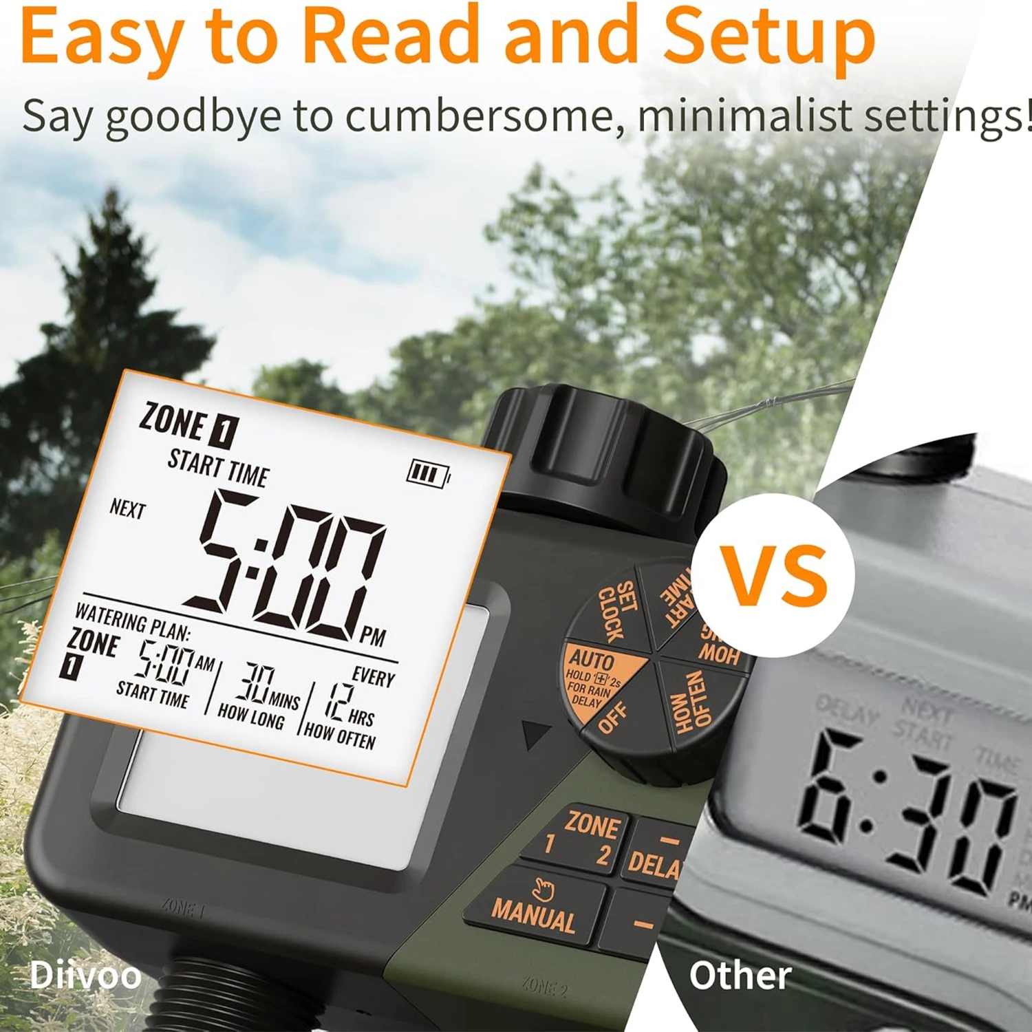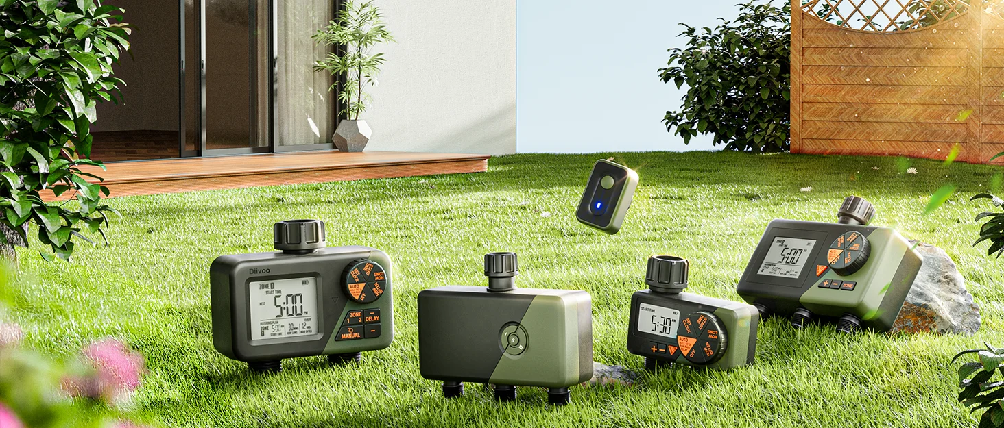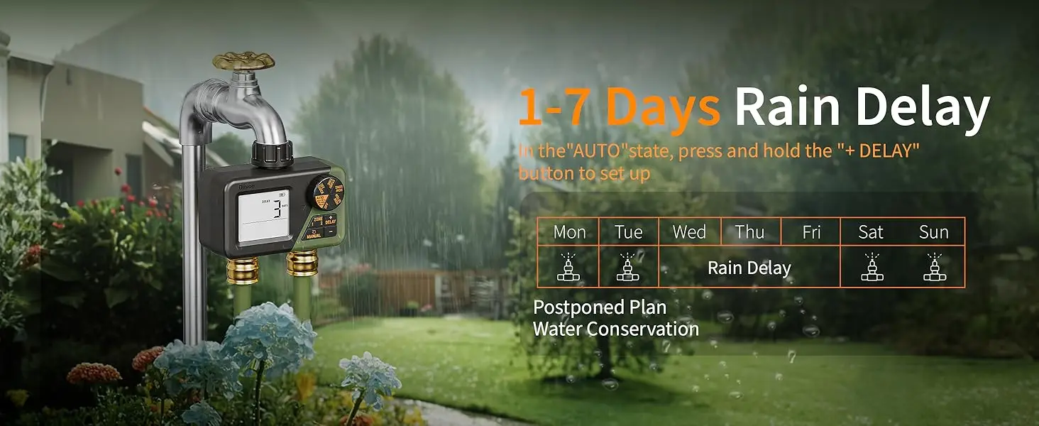 Multifunctional Watering Timer With the rain delay mode, you can suspend watering for 1 7 days to prevent overwatering and save water in rainy periods. The "Manual Watering" mode allows you to temporarily irrigate without interrupting the preset watering program. (Note: Diivoo dual trousers timer without rain sensor, so you can move your schedule through the local weather forecast) .