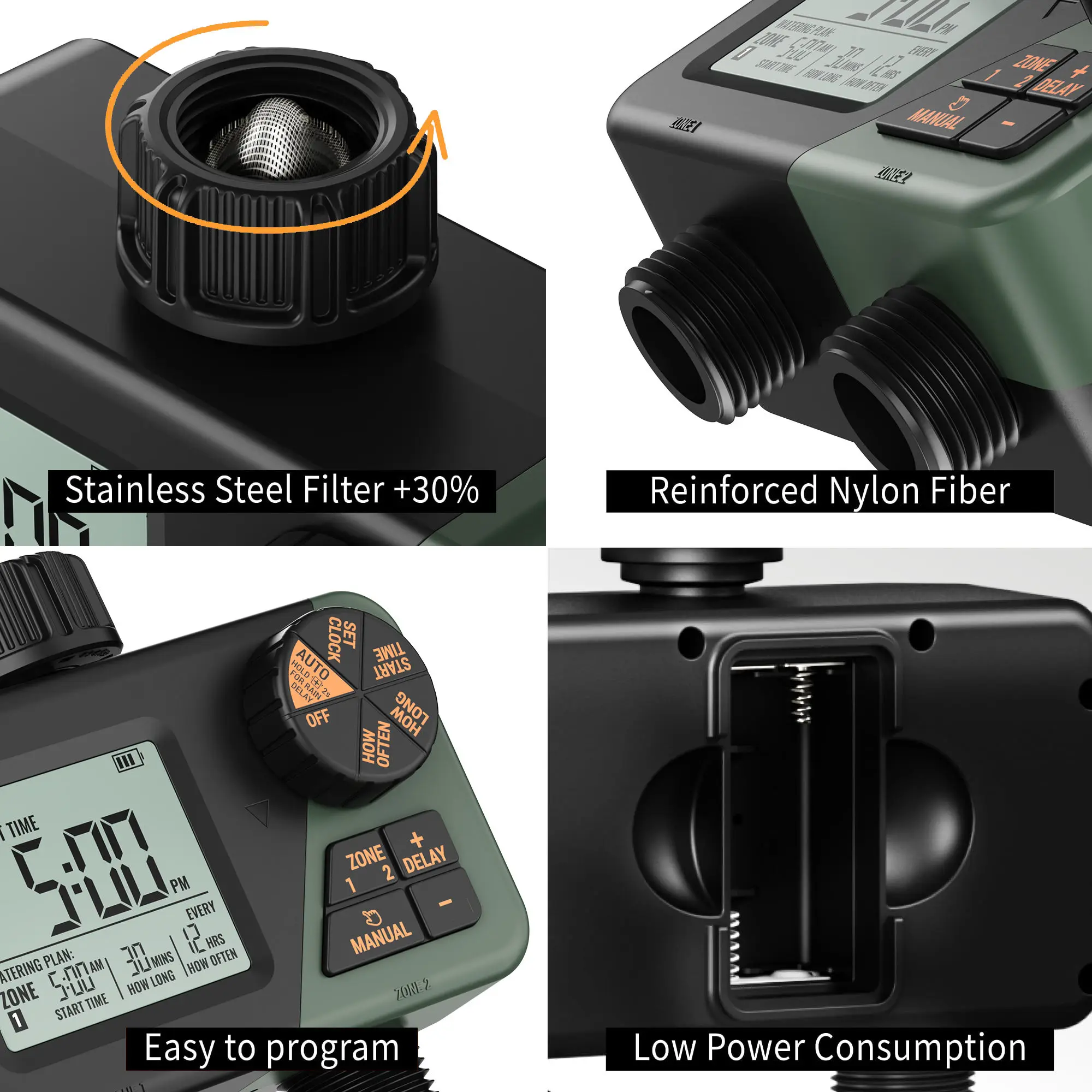 The connectors of the watering timer are made of 30% reinforced nylon material, which can withstand high water pressure from 7.25 psi to 116.03 psi. In addition, watering timer for hose with aluminium alloy filter, thread sealing tape and sealing disc to prevent it from leaks.
