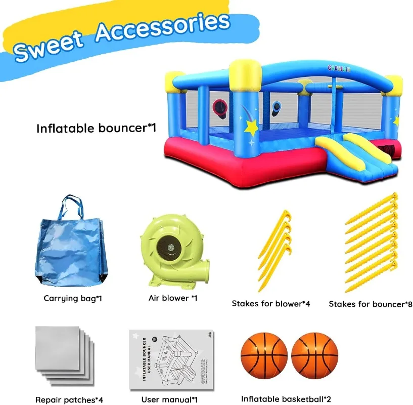 Products include inflatable bouncer, heavy duty blower,stakes for blower,stakes for bouncer,repair patches,carrying bag,inflatabe basketball