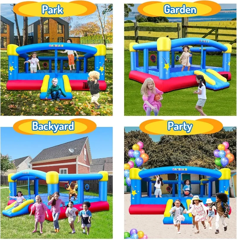 ENDLESS FUN WITH THE BOUNCER-The Causeair inflatable bouncy castle with huge jumping area and slide provides a variety of entertainment and bonding time for children and families. The innovative basketball hoop and throw ball game design allows kids to enjoy competitive games and dunking fun with friends. Inflated size:15’L*14.8’W*’6.8’H(ft).Weight limit: Max total weight 500 lbs. Max individual weight: 80 lbs