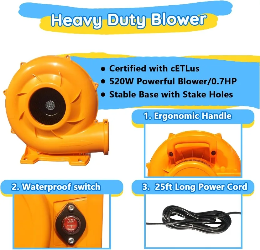 SAFETY FOR KIDS-Manufactured with the high standard of quality non-toxic materials to ensure the safety and satisfaction of children. The jumping area made of durable composite PVC material to improve the strength and durability of the product. There are 3 sides of mesh safety net around the jumping area as well as side entrance with velcro design to protect your child from falling while jumping. The water cover button design and Blower with GFCI plug keep you and your child safe while playing